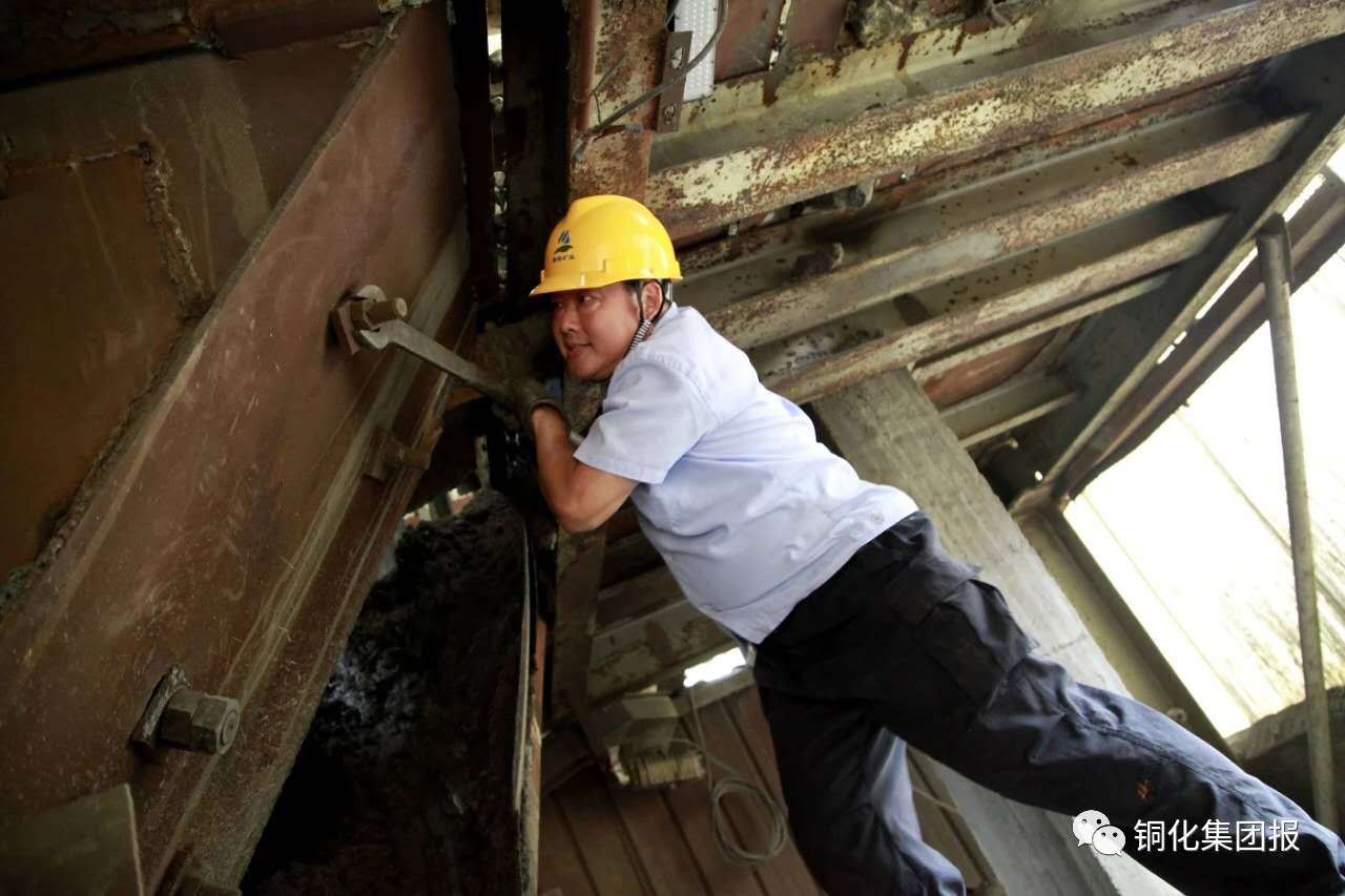 下了皮帶廊,走到主井礦倉下,老郭自豪地指著頭頂上方:“8個漏斗,過去維修和更換都是委外,現在都是我帶人自己干……省多少錢我不曉得,自己的事情就該自己干,能省一個是一個!”說到興奮時,他還掏出手機上圖片給我講2個月前他們打的一場硬仗:主井35米礦倉漏斗因礦石提運沖擊導致四邊混凝土嚴重磨損,礦業公司聽取老郭的建議,準備為漏斗四邊安裝4塊鋼板以保護受損的混凝土墻體。為了最大限度減少對主井出礦的影響,只給他們48小時的停產時間。頭一次接這大活的老郭也沒犯怵,提前準備好鋼板、木條等材料,將8名維修工分成3班,白班和小夜班清漏斗、制作安裝安全護板、鑲嵌鋼板,大夜班專門焊接鋼板。啃了2天的方便面,提前2小時完工將漏斗交付使用……