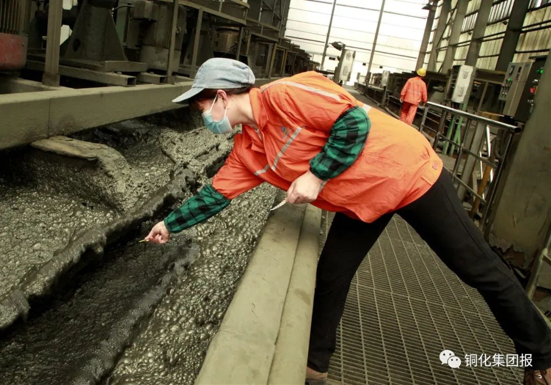 圖③:在選礦廠磨浮車間,選礦女工正在用pH試紙測(cè)試礦漿酸堿值。