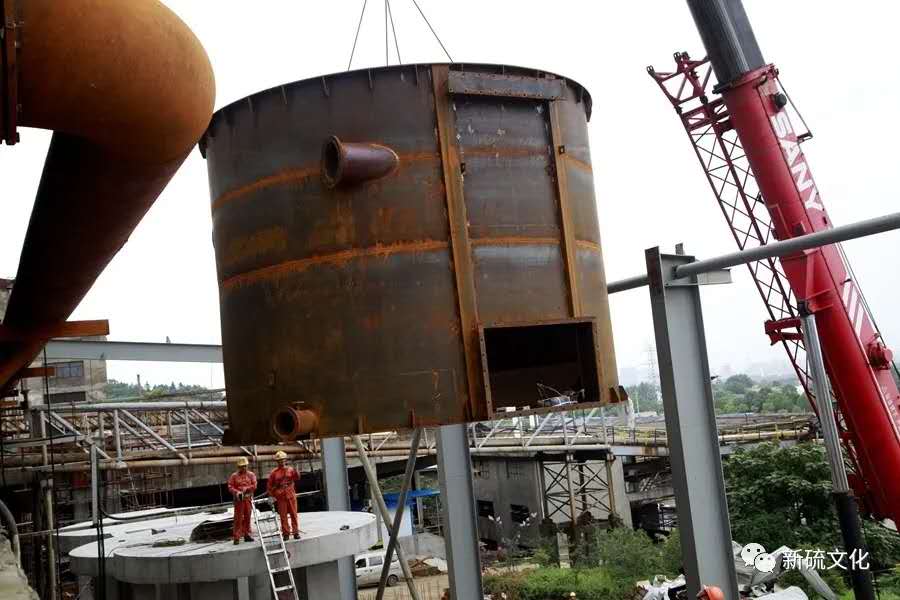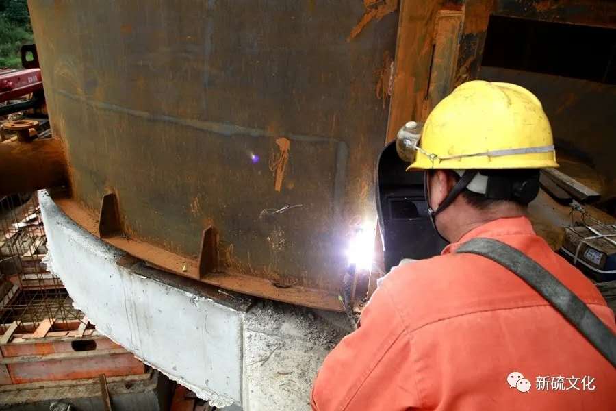 地面上大吊車、大貨車,選礦廠相關負責人、技術人員、安全員等忙著起吊龐然大物時,“焊高組”在底座上也一刻沒閑著,拖運電焊設備、準備焊接材料、在底座上鋪水泥保持平面,各個槽體支腳找平衡......由于底座緊挨著磨浮車間,空氣不流通,加上天氣悶熱難擋,武裝整齊的好“焊”們一會就汗濕了工作服,汗珠順著安全帽壓著的發根往下滾。